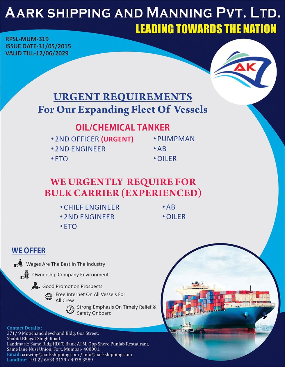AARK Shipping and Manning Pvt. Ltd.,(ASMPL) is a professionally managed company, catering to service requirements of ship owners, ship managers and endeavours to be a strategic partner amongst its valued client. ASMPL was established in 2009 and is ISO 9001:2015 Certified company. ASMPL is holding the required RPS Licence which is valid till 31st May 2024 issued by Director General of Shipping ( G.O.I.) along with MLC-2006 CL-1,4 which is issued by IRQS (Indian Register Quality System ).Our Team comprises of a Fleet of Experienced Master Mariners, Marine Chief Engineer and Surveyors having an experience in almost all sectors of Shipping, Ship Repairs and Shipbuilding Industry.We have established credentials of being a quality provider of shipping solutions ranging from supplying Manpower to providing onboard technical support along with carrying out Ship Maintenance ,Repair, Vessel Audits and Surveys.Our business strategy is to be operationally excellent and cost effective by use of our knowledge base, Field expertise and detailed customer information which can enable us to design services and solutions tailored to the needs of customers.We strive to establish the synergy by focusing on the needs of customer and customizing the solutions to the requirements.