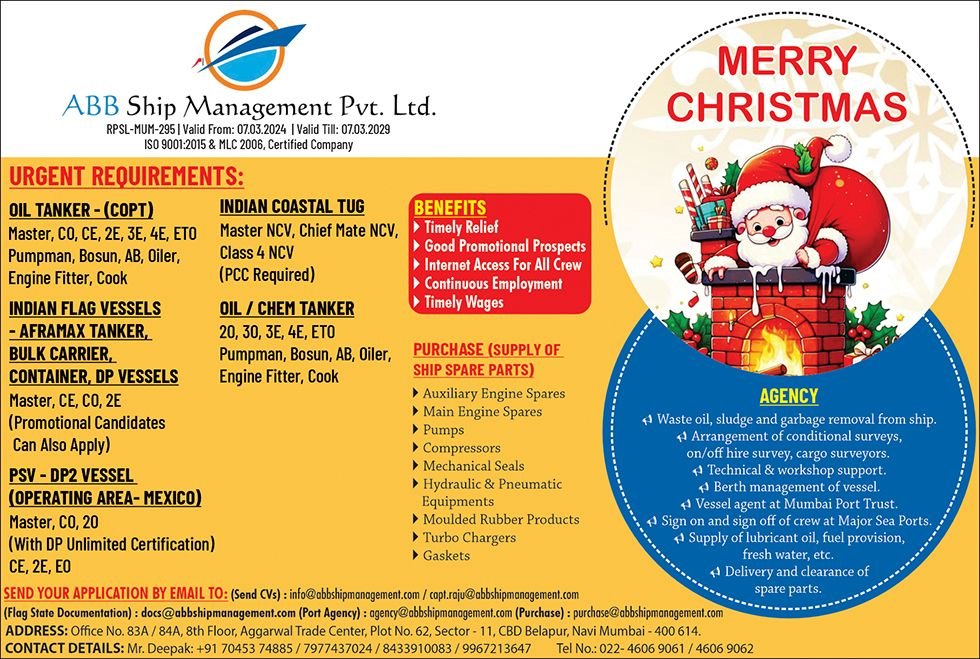ABB Ship Management Pvt. Ltd. is a reliable partner in Ship management and international manning services. We are organized company formed by the pool of shipping management directors and incorporators whose expertise is among the best in the labour relations, human resource, maritime laws, mass communications training and development. ABB Ship Management Pvt. Ltd. Owns and Operates a growing fleet of offshore support vessels for charter contracts.Our fleet is always well maintained and staffed with skilled, qualified & competent crew and our offices are manned be well experienced professionals from shipping fields.We guarantee efficient services in main fleet and Offshore Vessels of our Principals backed by systematized business procedures, pool of quality seafarers (Officers and Ratings) and continuous training through Safety, Awareness to Life and Protection of Environment. We are a company of people who brings growth to our Principals businesses as a means to secure QUALITY LIFE for our seafarers and their families.