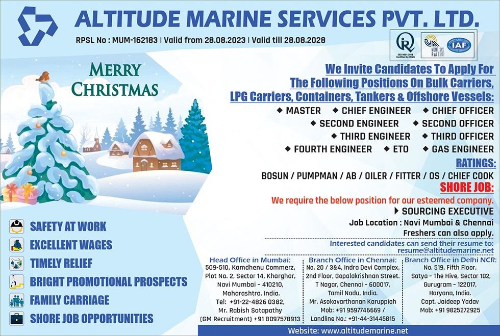 Altitude Marine Services Pvt. Ltd. is an Indian maritime services provider established in June 2023, headquartered in Navi Mumbai, Maharashtra. Company Details.The company offers end-to-end ship and maritime solutions, including crew management, technical ship management, crew training, safety, offshore crewing support, and inspections services. Its services extend to commercial management, chartering support, pre-purchase inspections, marine surveys, and port captaincy services.Altitude Marine aims to deliver tailored solutions with a focus on operational efficiency, safety, and compliance with maritime standards for seafarers.