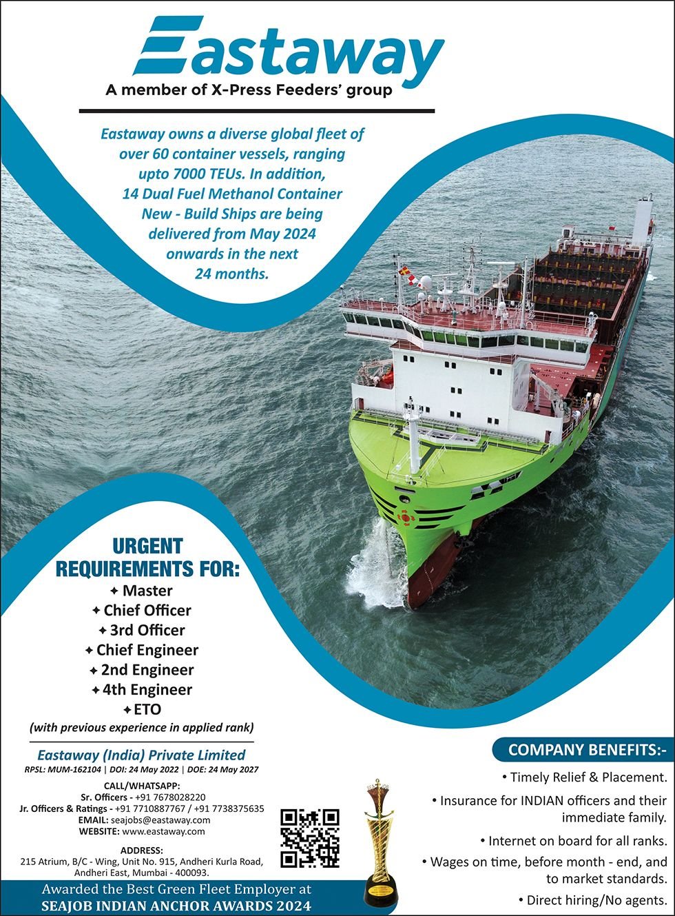 Eastaway is a leading owner and ship manager of container vessels worldwide. At Eastaway, we have over a decade of ship ownership experience, allowing us to provide the best modern technical management solutions for our principals.At Eastaway, we understand that collaboration and communication are intrinsic to customers getting their cargo safely from A to B. Our extensive portfolio of inhouse technology, alongside a highly experienced team and extensive support network, allows us to provide integrated maritime solutions, bespoke to our customers’ requirements.Eastaway owns a diverse global fleet of over 50 vessels, ranging from 700 TEU to 7000 TEU, as well as several new builds.They always ensure ships and services are compliant with mandatory rules, regulations, legal requirements, applicable codes, guidelines recommended by the International Maritime Organisation, flag administrators, classification societies, and maritime industry standards and best practices.