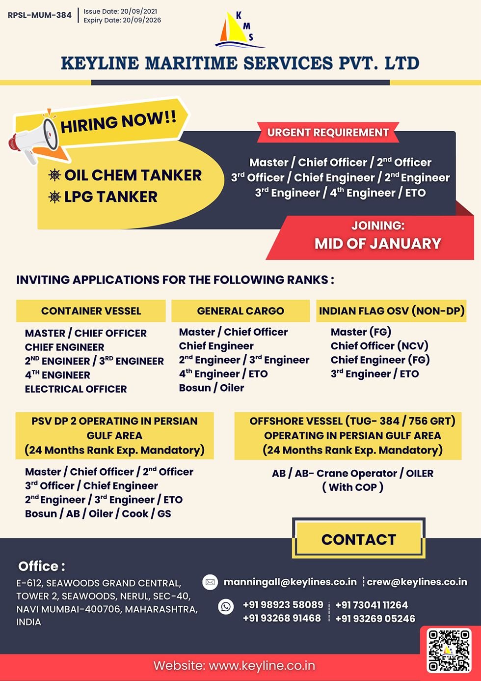 Keyline Maritime Services Private Limited (KMSPL), established in year 2015 with goals and vision to provide excellent marine based integrated services.KMSPL is equipped to efficiently manage complete spectrum of vessel management. We have a team of experienced, dedicated and committed marine professionals. Our services are designed around you.We have a team of experienced, dedicated and committed marine professionals.We grow with your growth. So we put our best effort to provide a safety environment.Our vision is to be at the forefront of a new era of Ship Management, combining traditional values and modern technology and being active in a number of specialized and diverse Shipping segments. To provide our Customers, either directly or through business partners and affiliated companies, Ship Management Services which are: