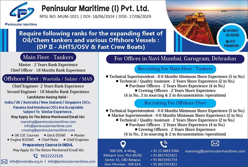 Peninsular Maritime Pvt. Ltd. is a fast-growing, India-based company providing customized, owner-specific services to its vessel owners. The company works as an extension of owner’s desk. As an independent third-party ship management firm, we proudly manage 500+ seafarers and 09 vessels, making us one of the youngest yet fastest-growing maritime companies in India. We are proud to be the trusted partner of several leading stakeholders across the maritime ecosystem, including investment house, chartering house, and recognized classification societies. Our long-standing collaborations are built on operational excellence, transparency, and shared commitment to maritime safety and performance.Our operations are strategically located in Navi Mumbai, India, allowing us to efficiently serve global maritime needs.
