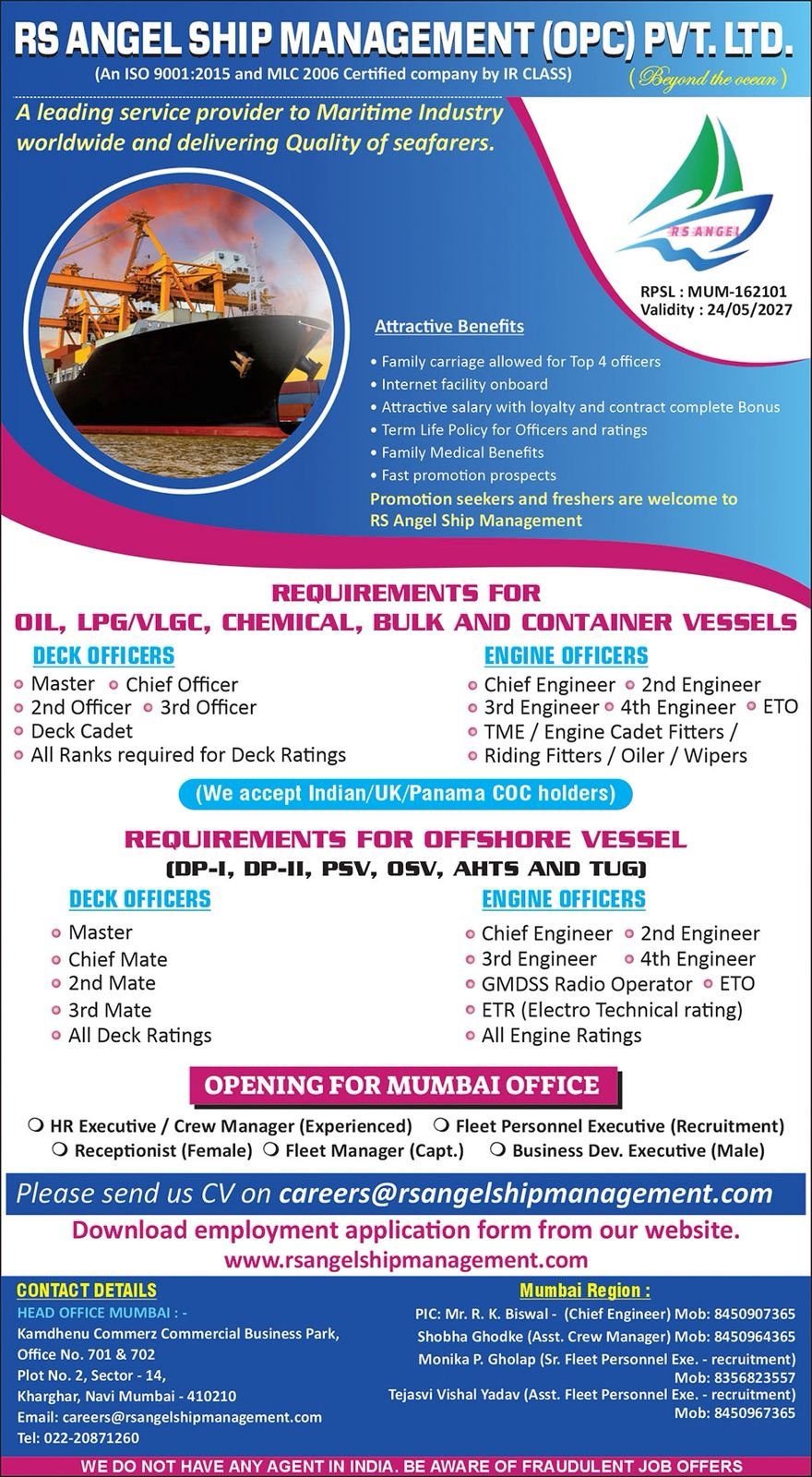 RS Angel Ship Management Company registered in Mumbai, the financial capital and shipping Hub of India. Our Founder & MD Mr. Rama Krushna Biswal is a Marine Engineer (Chief Engineer) and has experience about 21 years in the marine field and about 8 years as Chief Engineer in LPG vessels. .He has sailed top branded company like BSM, Anglo Eastern , Fleet Management, Dockendale ship Management & Exmar Ship Management etc. He has sailed in all types of Vessel such as VLGC, BULK, CONTAINER AND DP-I and DP-II vessels. He is actively involved and putting tremendous efforts to the growth and success of the company. We are an ISO 9001:2015 and MLC 2006 certified company and hold Recruitment and Placement Service License No. MUM-162101. Our crew recruitment services are as per RPSL guidelines issued by DG Shipping, Govt. of India and requirements of Reg. 14 MLC 2006. Our above credentials provide the necessary assurance to our clients regarding the reliability of the services we provide.