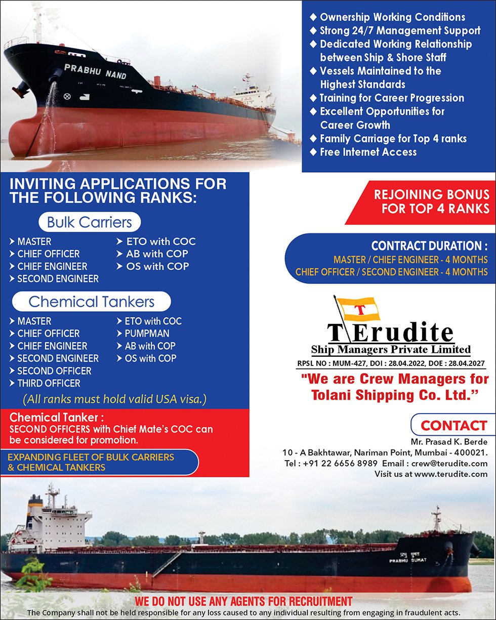 Tolani Shipping Company Limited is a ship owner and ship management company headquartered in Mumbai, India, incorporated on 29 January 1974. It owns and operates an approximate fleet of 9 vessels, including dry bulk carriers and stainless-steel oil/chemical tankers, and provides in-house technical and personnel management. With over five decades of experience in maritime transport, Tolani Shipping focuses on global bulk commodity and chemical/oil transport, backed by experienced maritime professionals and a commitment to safety, environmental stewardship and operational efficiency.