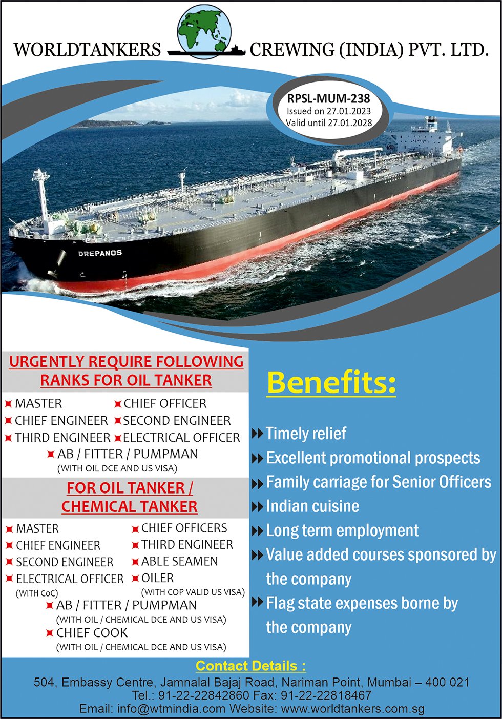 World Tankers Management Pte Ltd is a Singapore-headquartered tanker ship-management company founded in 1993 by the Haji-Ioannou family. It specializes in technical, operational, crewing and commercial management of Aframax, MR product and chemical tankers and maintains additional offices in Mumbai (India) for crewing and London (UK) for chartering support. The company manages an estimated ~8 vessels and employs around 500 personnel across its global network. Known for its personalized service approach and commitment to safety and operational excellence, World Tankers serves shipowners seeking high-quality asset management solutions.
